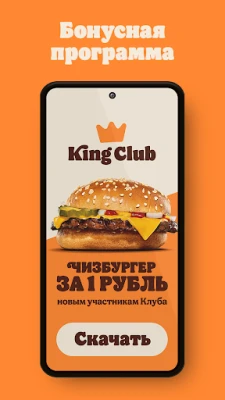 King Club — бонусная программа в приложении BURGERKING, за каждый заказ еды Вам начисляется корона. Присоединяйтесь, приходите в наши рестораны, копите короны за заказы, получайте блюда за них, а потом обменивайте короны на новую еду.