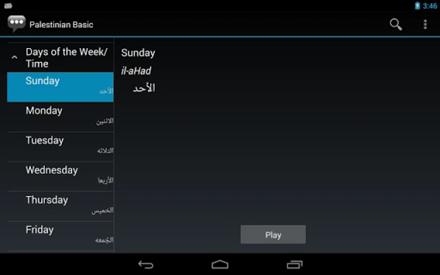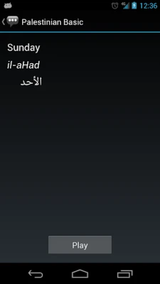 3. On the phrase detail page, the Palestinian phrase is shown alongside its pronunciation and the equivalent English phrase. Press the Play button to hear the audio pronunciation by a native speaker.